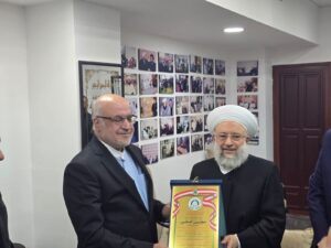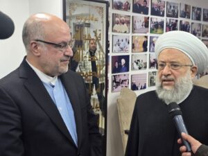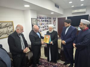 ‏من جهته قدم سماحته درعاً تكريمياً لسعادة السفير، مشيدا بصبره وما اظهره من عزة وافتخار بالحق، اثر اصابته في عملية البيجر الغادرة، حيث امتزج دمه بدماء المجاهدين، وأشاد بدوره في إقامة علاقات على كافة الساحة اللبنانية، مؤكدا أنه طالما ان ايران ترفع لواء فلسطين ومواجهة الاستكبار، وتصدق في شعاراتها في هذا الاتجاه، فإنها أقوى من المؤامرات التي تستند على الأبعاد المذهبية أو القومية والافتراءات الفاضحة وتزوير التاريخ والوقائع الساسية المعاصرة.